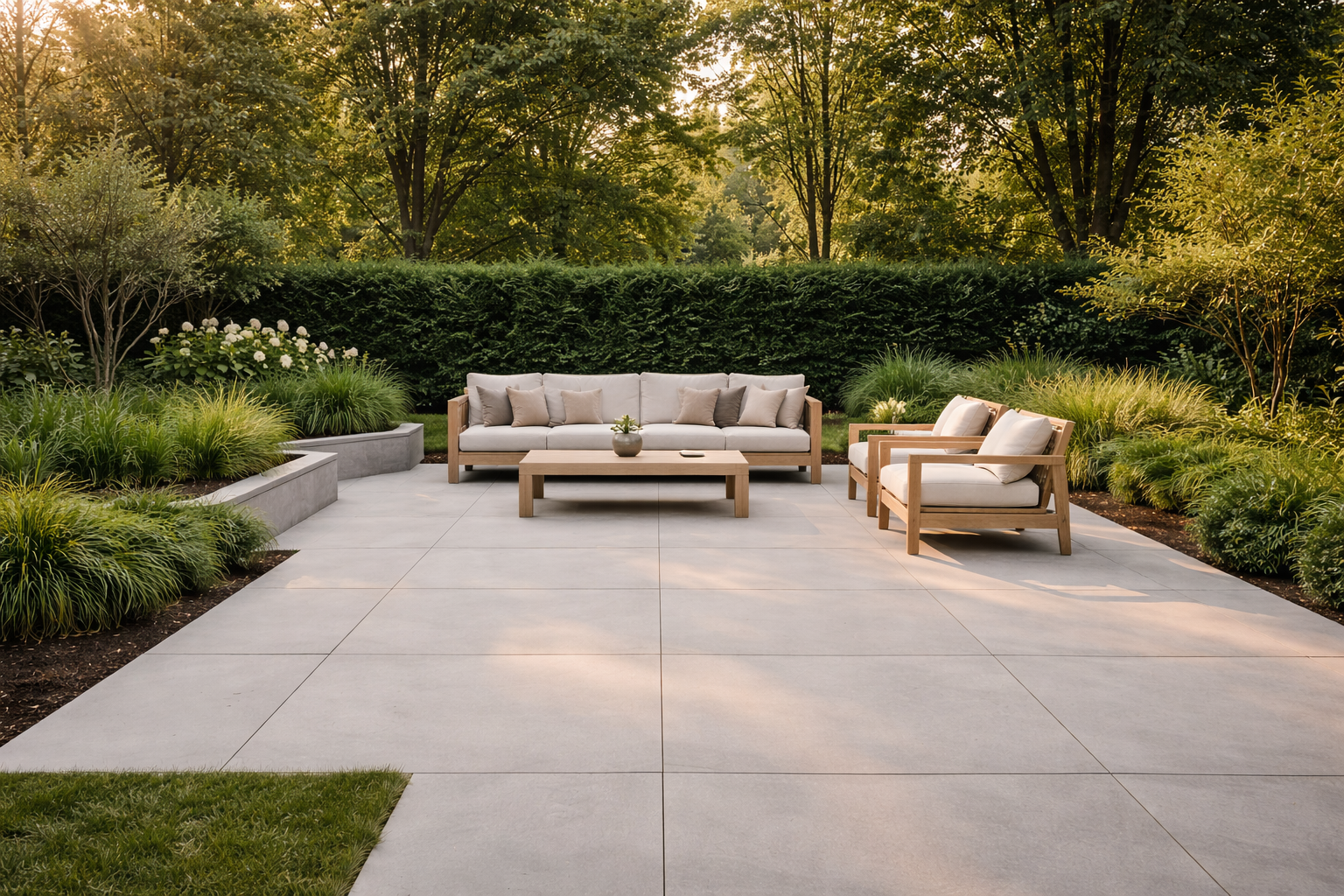 Zie je grote tegels als “vloer”, dan wordt een grote tuin makkelijker te ontwerpen. Je hoeft niet overal te variëren; je hoeft vooral te zorgen dat alles logisch aanvoelt.